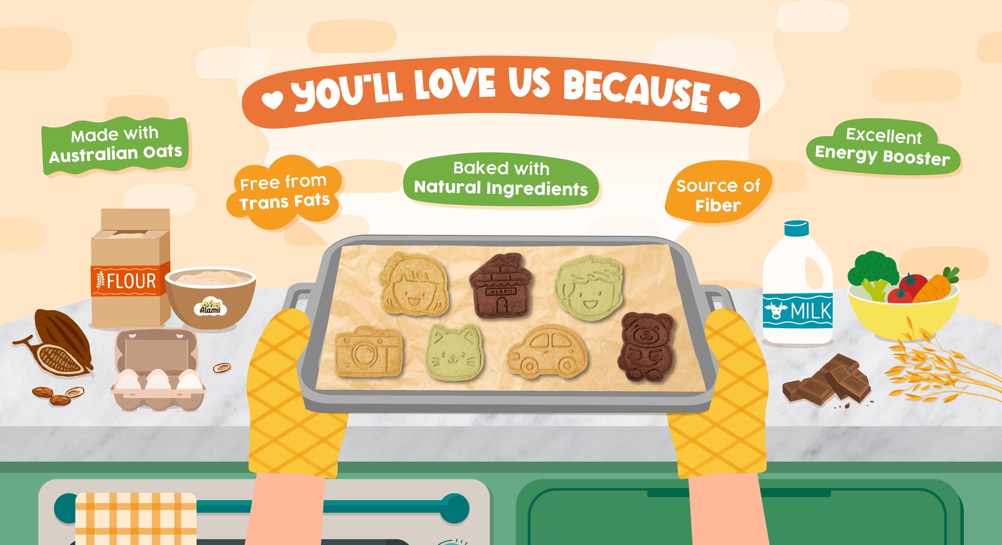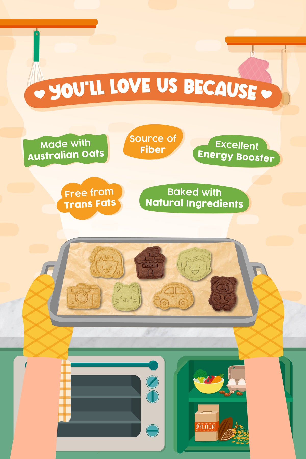 You'll love our biscuits! Because our biscuits is multigrain, made with oat from Australia, rich in fiber, transfat free, also we only use natural ingredients and good things in it!